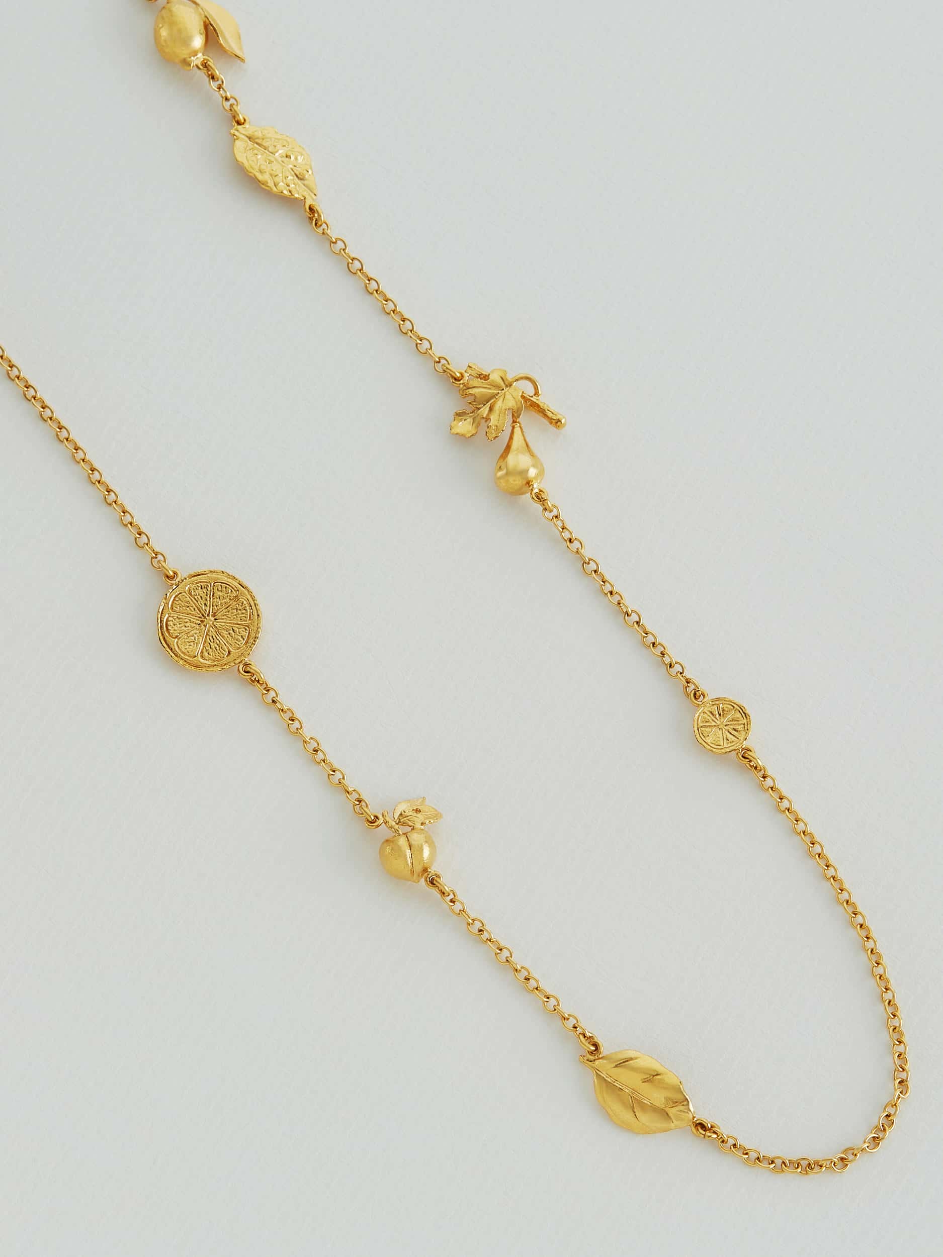 This long chain necklace is dotted with a fruity medley of peach, fig and citrus charms, alongside basil and mint leaves. This style comes on an adjustable 26 -28’’ length, and will lend an air of carefree Mediterranean glamour to any outfit or occasion. Handmade in Sterling Silver and plated with Fairmined Gold.
