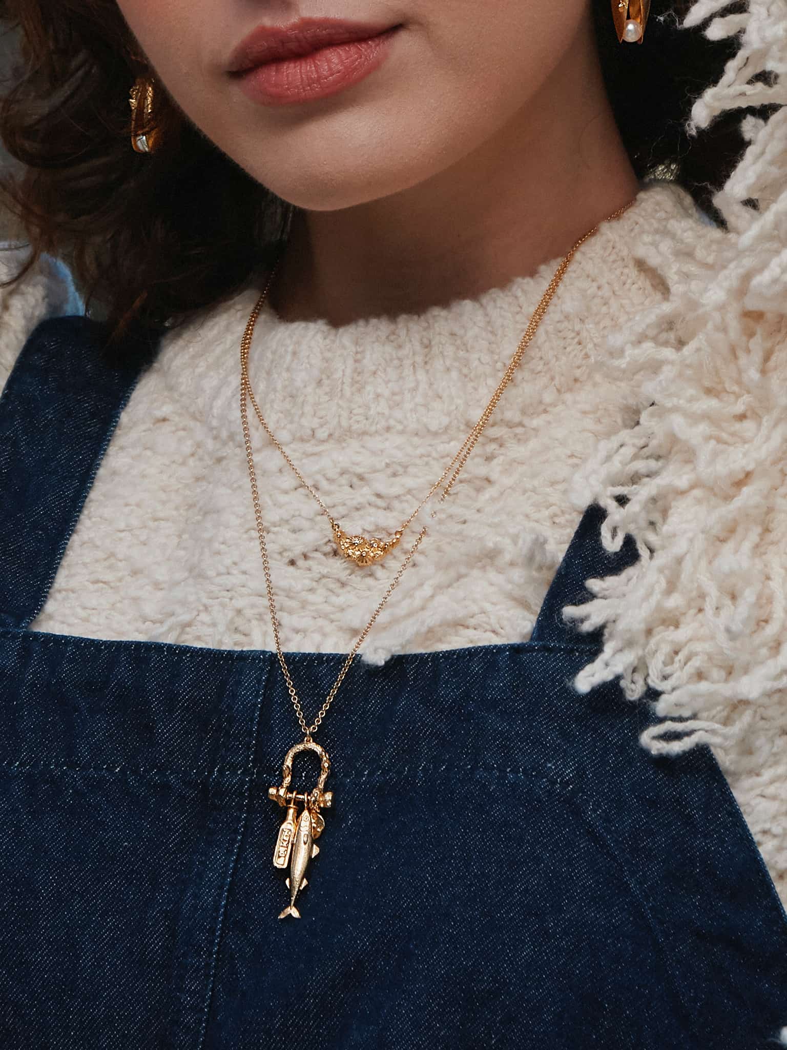 This playful necklace is inspired by exploring docklands and harbours when mudlarking on the shores. An array of charms hang from a textured chain link - a quirky fish, miniature poison bottle and a weathered anchor token. Handmade in our London workshop.