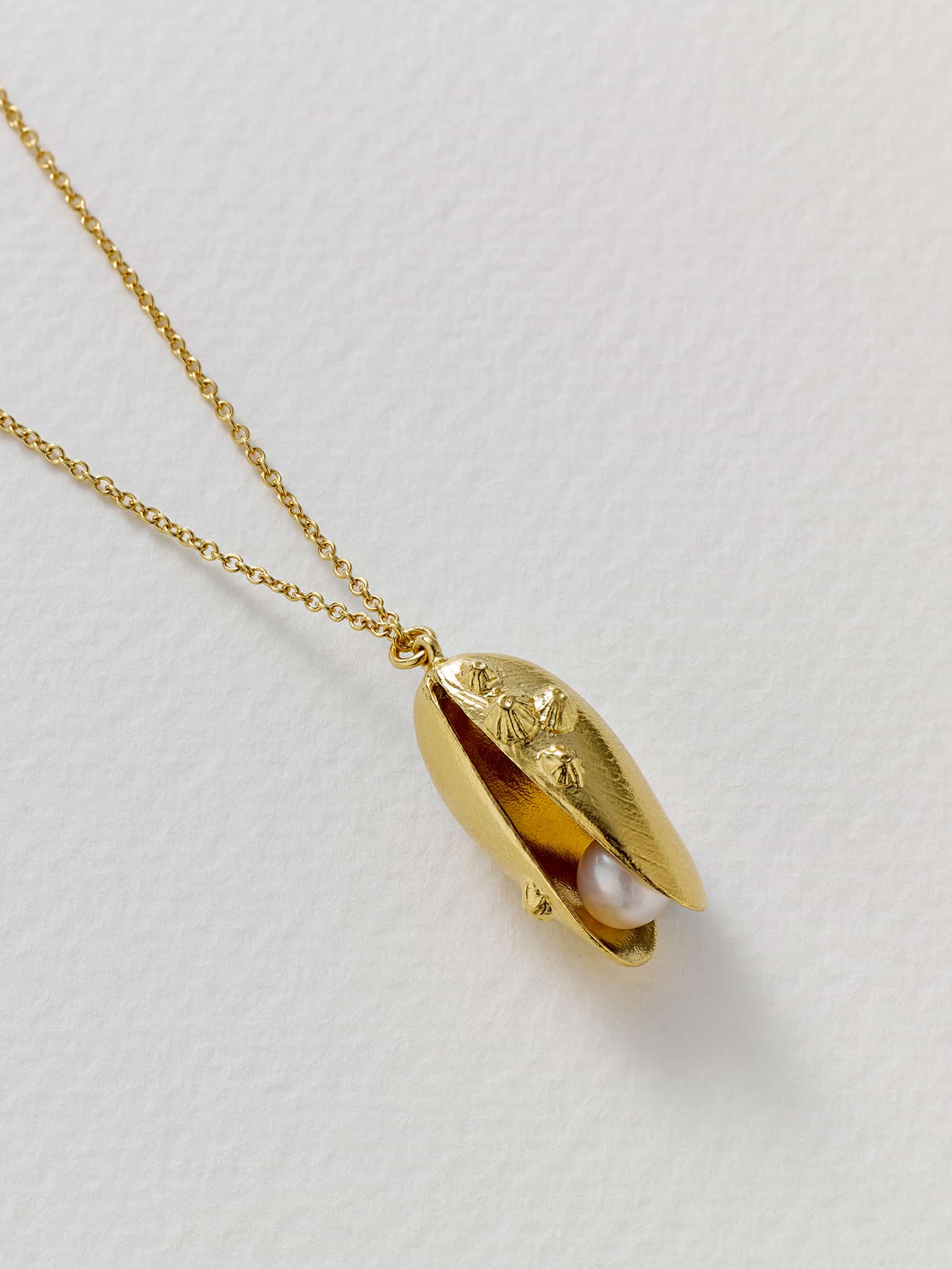 The irresistible allure of a freshwater pearl is held within a slightly open mussel shell, complete with details of barnacles and limpets in this playful necklace. Handmade in our London workshop.