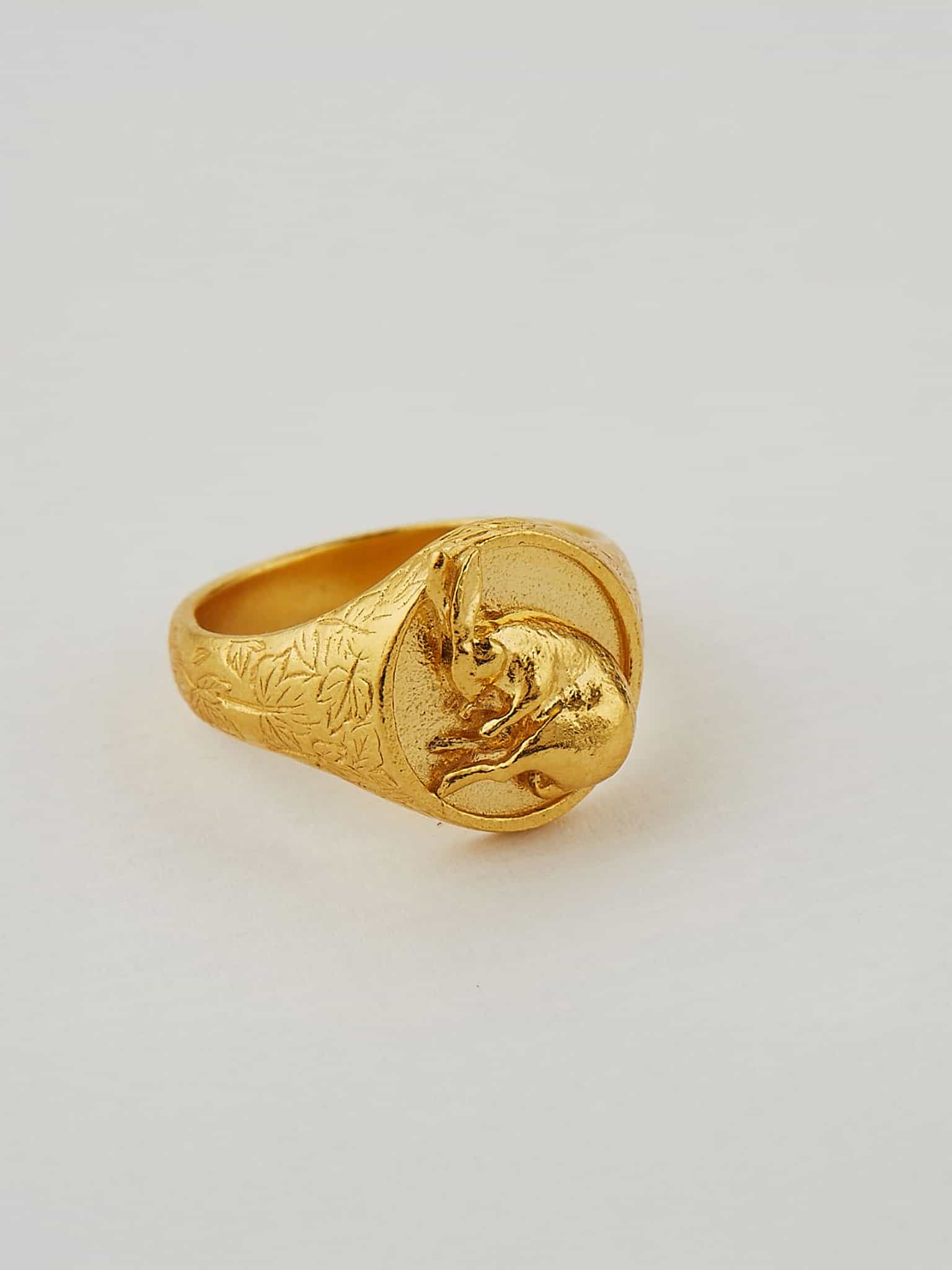 Our Sleeping Hare Engraved Signet Ring has been handmade by our expert jewellers in Sterling Silver, with the option of licensed Fairmined Gold Plate. This plating has been responsibly sourced from the Iquira Mine in the Huila region of Columbia.