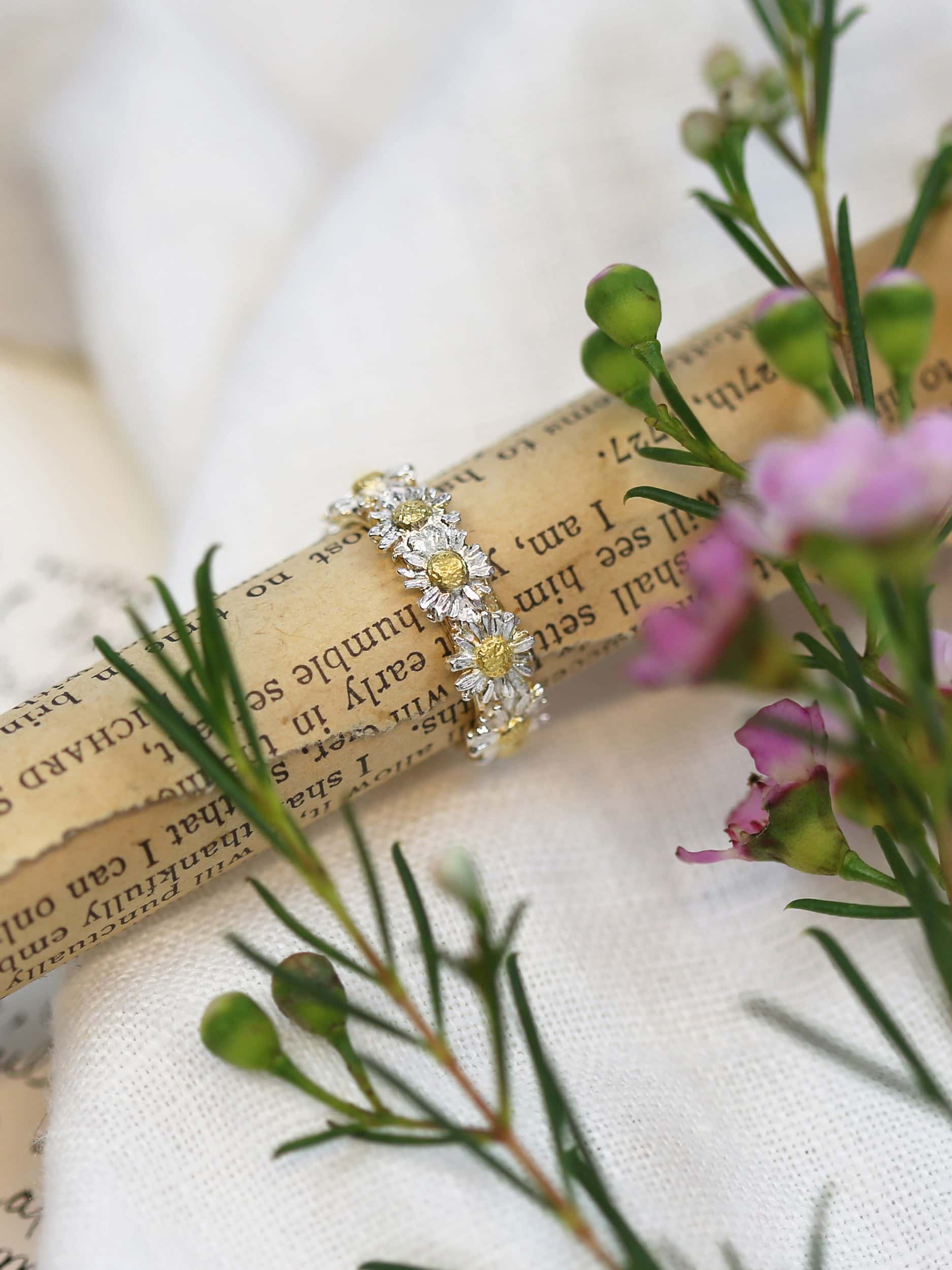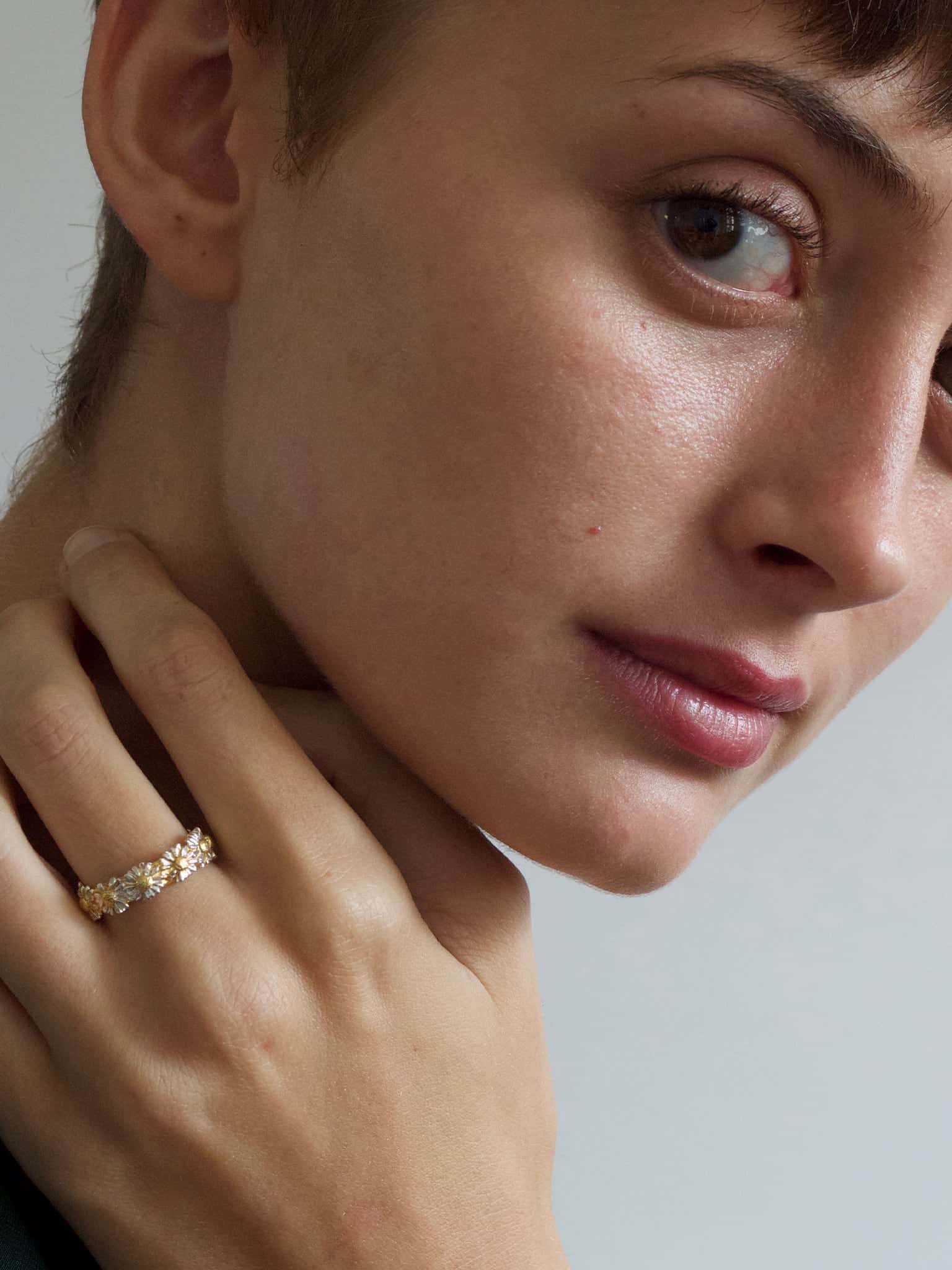 A wreath of radiant daisies have bloomed together to form a beautiful floral ring. Handcrafted from Sterling Silver with a 22ct gold plated band, every individual daisy has a gold centre.