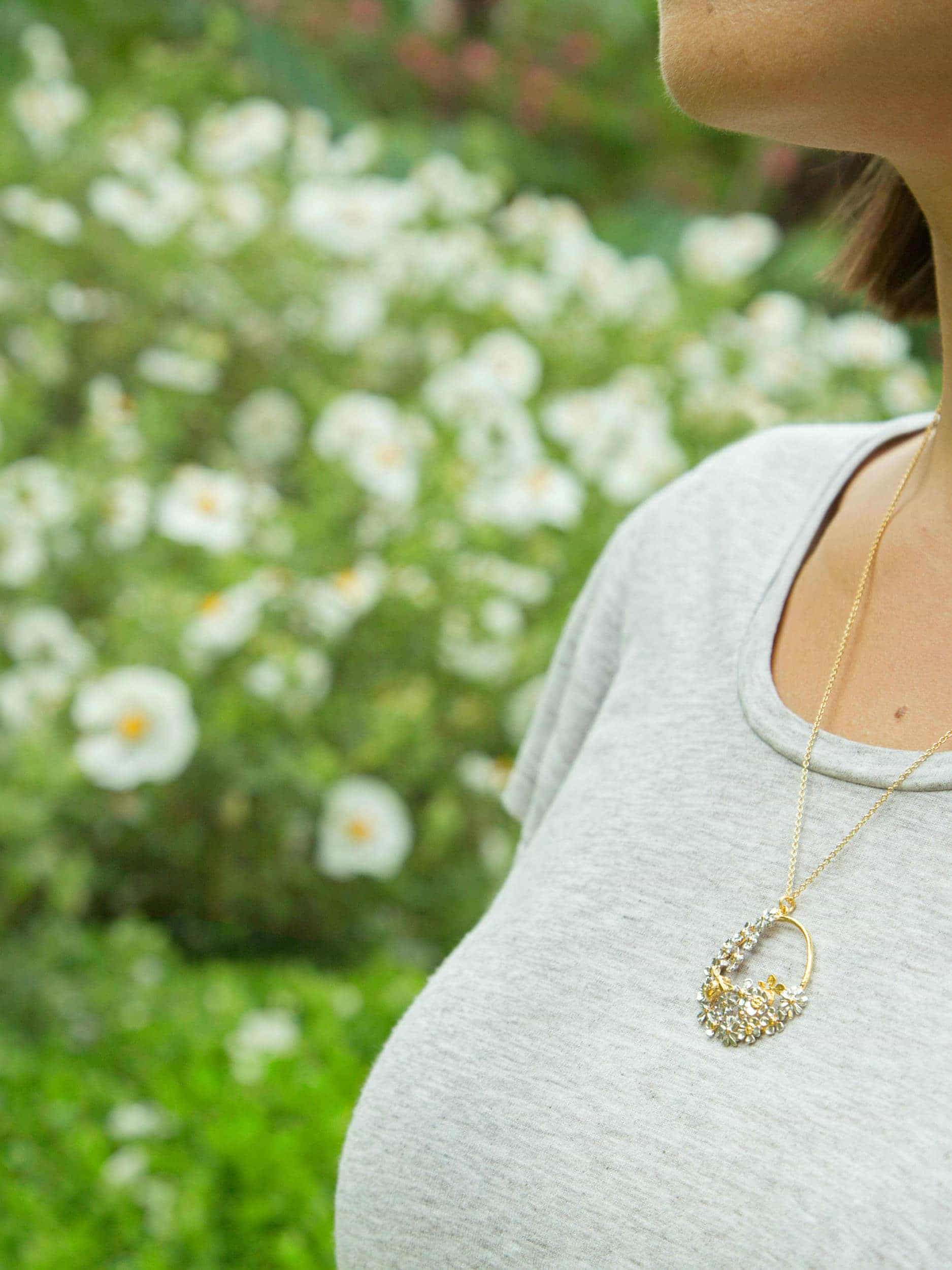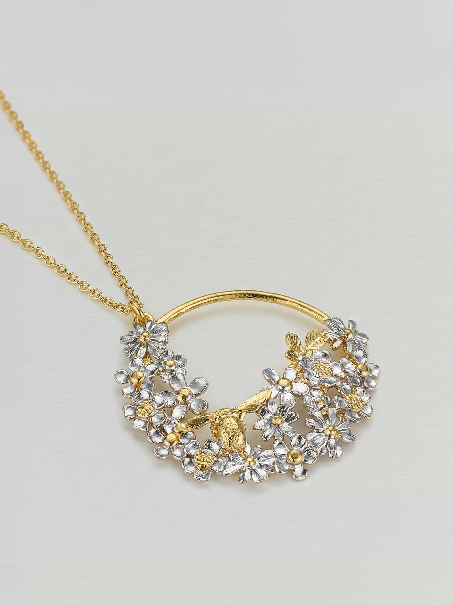A tiny Bumblebee seeks nectar from a loop of spring flowers, in our bee-loved Posy Bloom Necklace! Alex Monroe Jewellery is inspired by nature and handcrafted in our London Workshop.